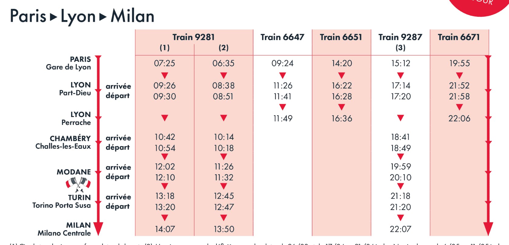 Trenitalia has released schedules for trains from Paris to Lyon, France, to Milan, Italy, and from Milan to Lyon and Paris bookable for travel between December 11, 2022 and June 10, 2023.